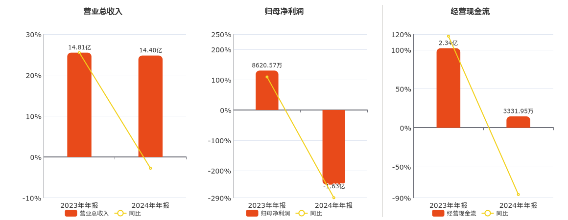 公司营业总收入为14.40亿元,较去年同报告期营业总收入减少4119.27万元,同比较去年同期下降2.78%。归母净利润为-1.63亿元,在已披露的同业公司中排名第92,较去年同报告期归母净利润减少2.50亿元,同比较去年同期下降289.61%。经营活动现金净流入为3331.95万元,在已披露的同业公司中排名第62,较去年同报告期经营活动现金净流入减少2.00亿元,同比较去年同期下降85.73%。