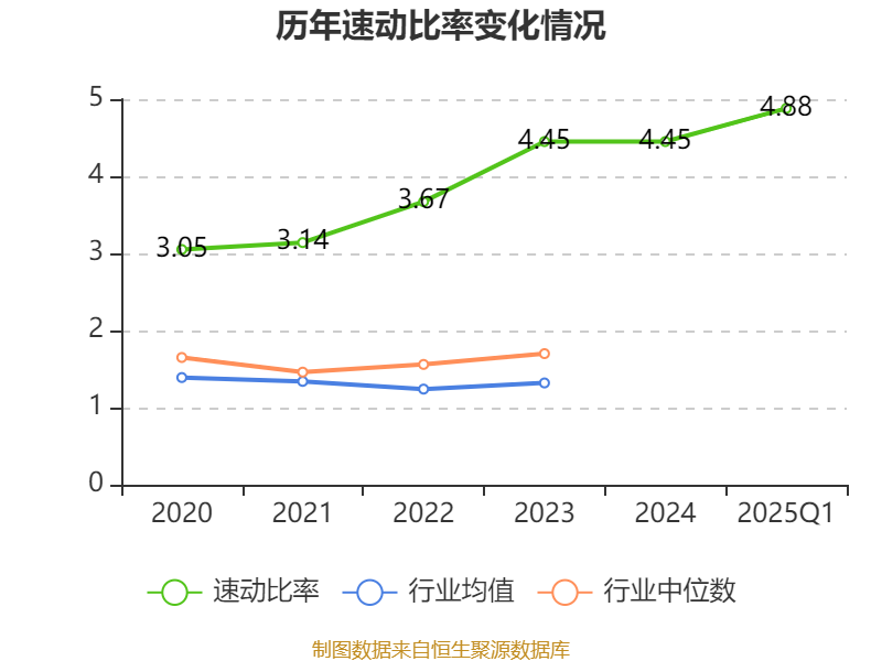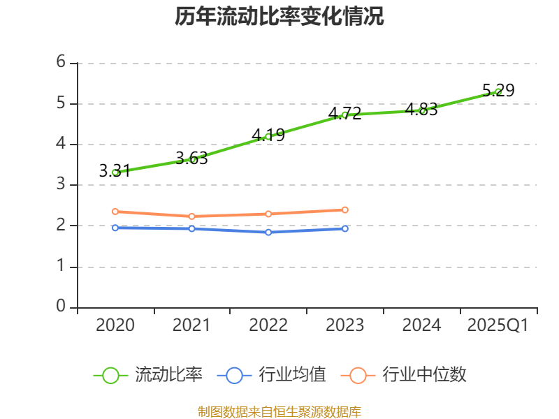 2025年第一季度,公司流动比率为5.29,速动比率为4.88。