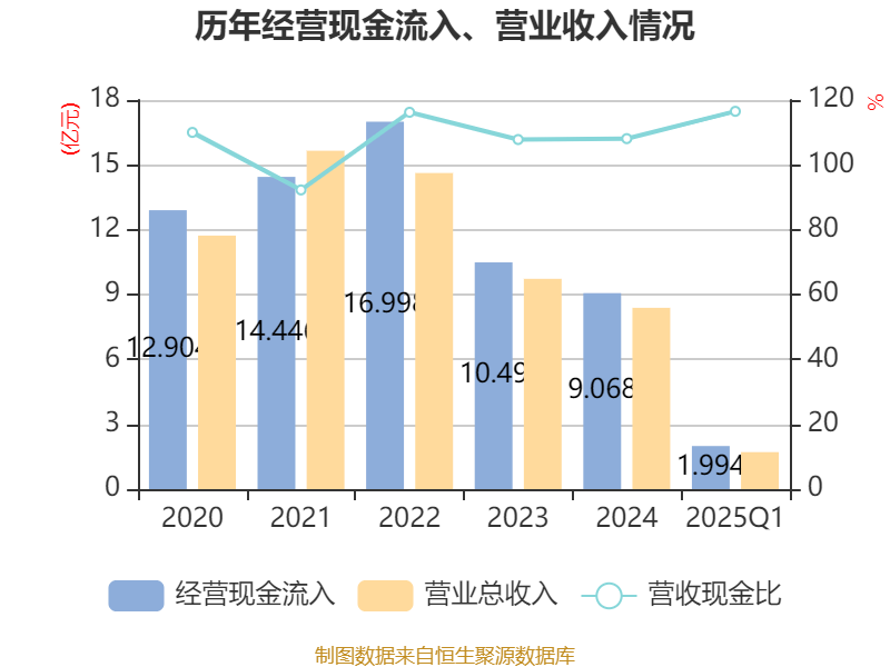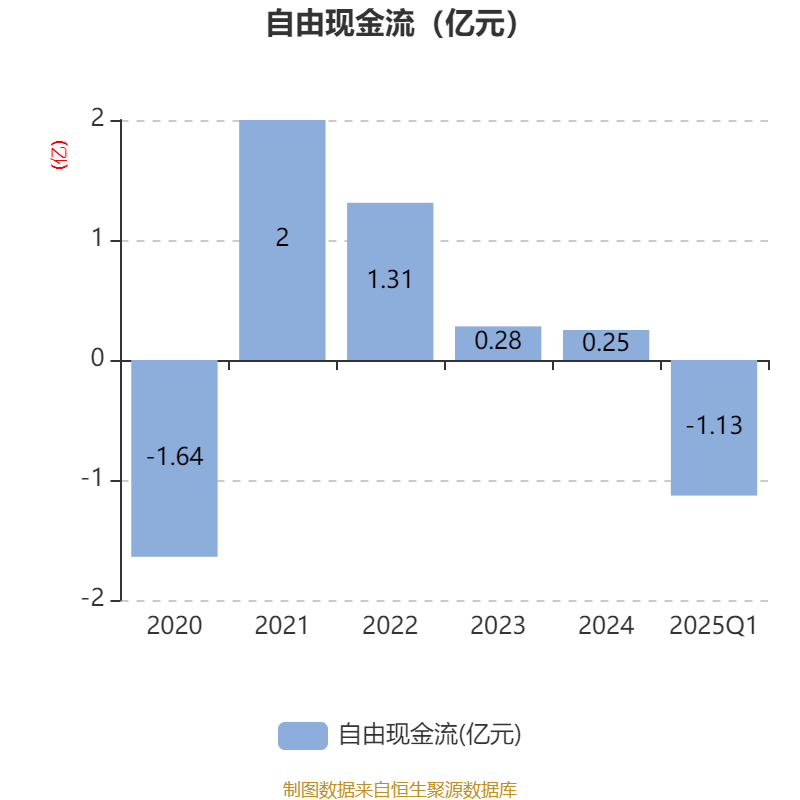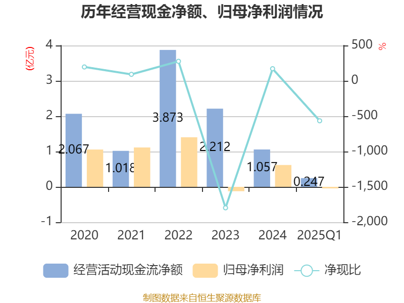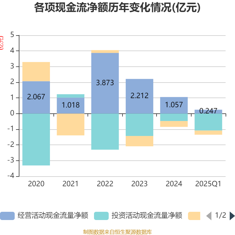截至2025年一季度末,公司经营活动现金流净额为2470.19万元,同比增加2960.6万元;筹资活动现金流净额-2653.17万元,同比减少2103.51万元;投资活动现金流净额-1.08亿元,上年同期为-5597.84万元。