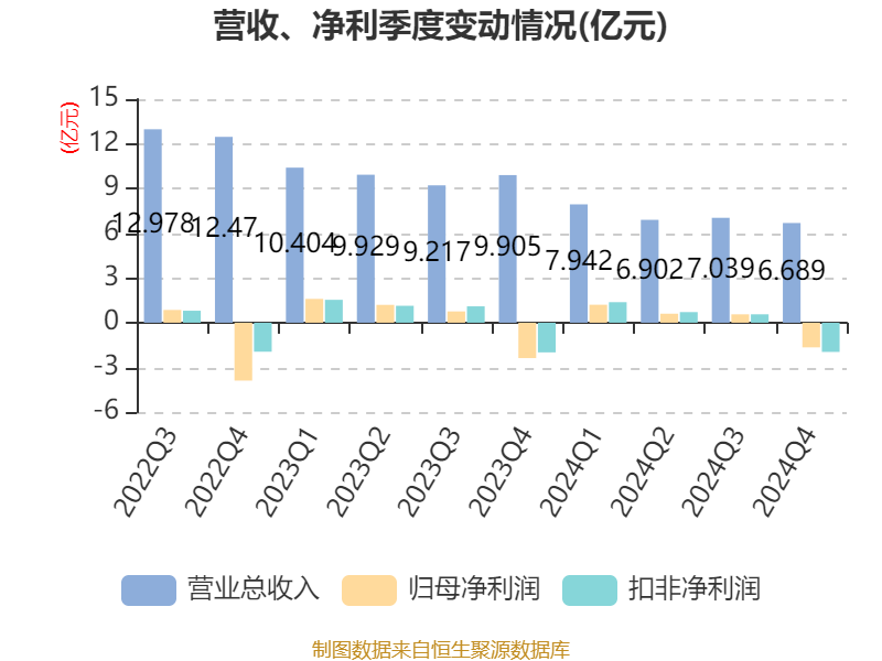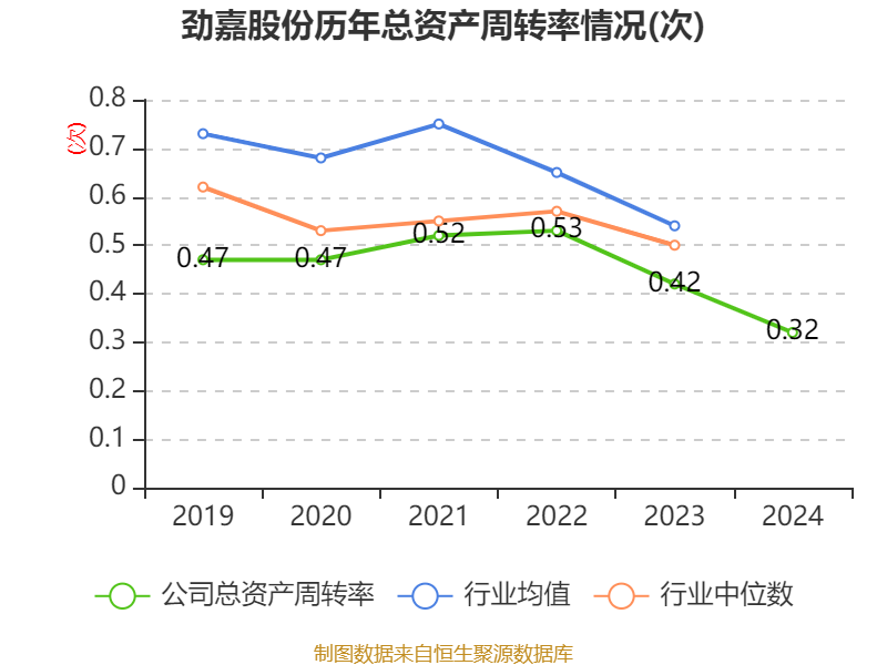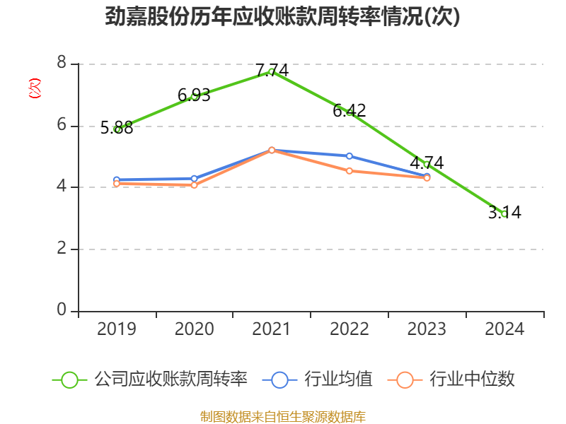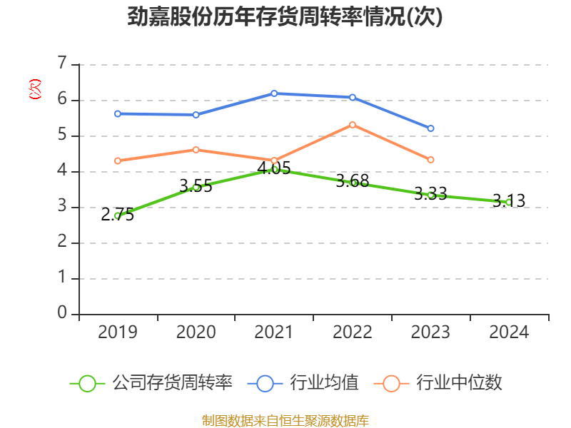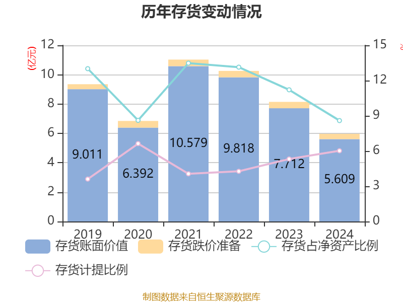 从存货变动来看,截至2024年末,公司存货账面价值为5.61亿元,占净资产的8.59%,较上年末减少2.1亿元。其中,存货跌价准备为3593.83万元,计提比例为6.02%。