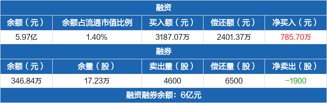 融资方面,当日融资买入3187.07万元,融资偿还2401.37万元,融资净买入785.7万元。融券方面,融券卖出4600股,融券偿还6500股,融券余量17.23万股,融券余额346.84万元。融资融券余额合计6亿元。