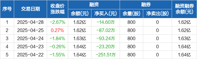 融资方面,当日融资买入394.94万元,融资偿还409.54万元,融资净偿还14.6万元,连续6日净偿还累计623.92万元。融券方面,融券卖出0股,融券偿还0股,融券余量800股,融券余额2912元。融资融券余额合计1.62亿元。