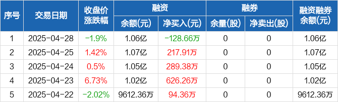 凯龙高科融资融券信息显示,2025年4月28日融资净偿还128.66万元;融资余额1.06亿元,较前一日下降1.2%。
