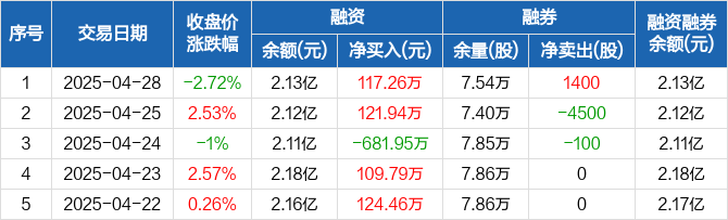 融资方面,当日融资买入1208.33万元,融资偿还1091.07万元,融资净买入117.26万元。融券方面,融券卖出1400股,融券偿还0股,融券余量7.54万股,融券余额29.71万元。融资融券余额合计2.13亿元。