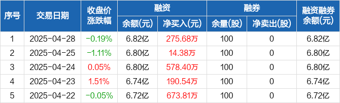 融资方面,当日融资买入2062.95万元,融资偿还1787.26万元,融资净买入275.68万元,连续6日净买入累计3368.58万元。融券方面,融券卖出0股,融券偿还0股,融券余量100股,融券余额2054元。融资融券余额合计6.82亿元。
