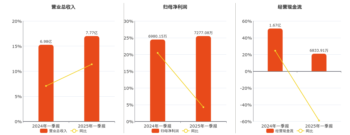 公司营业总收入为7.77亿元,较去年同报告期营业总收入增加7939.09万元,实现5年连续上涨,同比较去年同期上涨11.38%。归母净利润为7277.08万元,较去年同报告期归母净利润增加296.93万元,实现5年连续上涨,同比较去年同期上涨4.25%。经营活动现金净流入为6833.91万元。