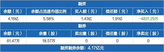 融资方面,当日融资买入1.43亿元,融资偿还1.91亿元,融资净偿还4831.29万元。融券方面,融券卖出0股,融券偿还0股,融券余量18.57万股,融券余额61.47万元。融资融券余额合计4.17亿元。
