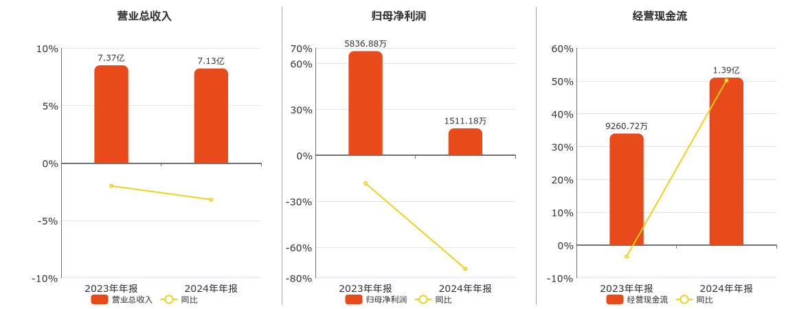 公司营业总收入为7.13亿元,在已披露的同业公司中排名第97,较去年同报告期营业总收入减少2352.09万元,同比较去年同期下降3.19%。归母净利润为1511.18万元,在已披露的同业公司中排名第103,较去年同报告期归母净利润减少4325.70万元,同比较去年同期下降74.11%。经营活动现金净流入为1.39亿元。