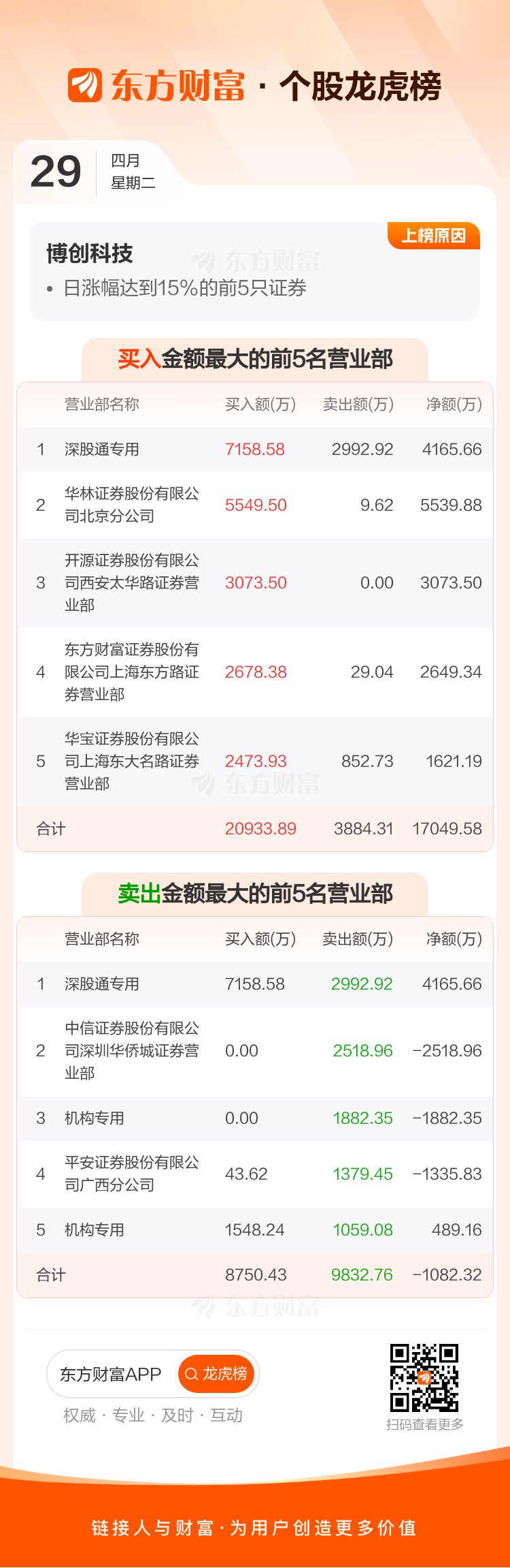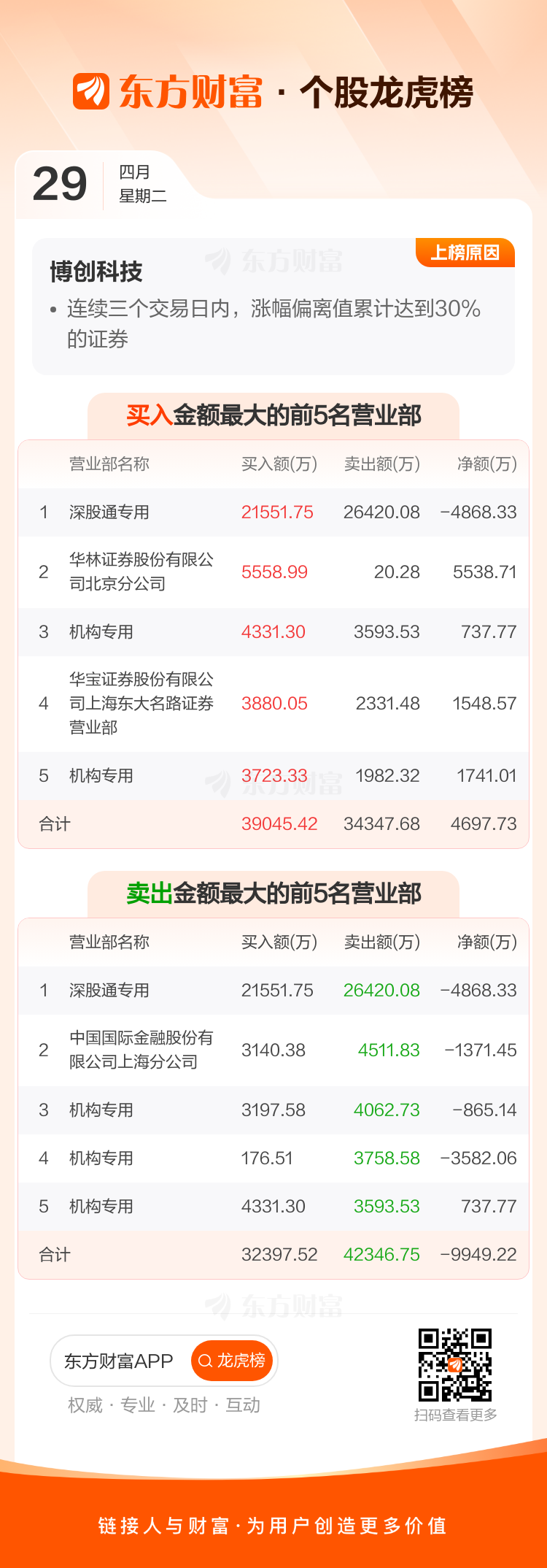 交易所2025年4月29日公布的交易公开信息显示,博创科技因成为日涨幅达到15%的前5只证券、连续三个交易日内,涨幅偏离值累计达到30%的证券上榜。博创科技当日收报44.5元,涨跌幅20.01%,偏离值20.00%,换手率11.53%,成交额13.43亿。异常期间4月25日至4月29日,期间涨幅30.23%,累计偏离值30.51%,区间成交额34.37亿。