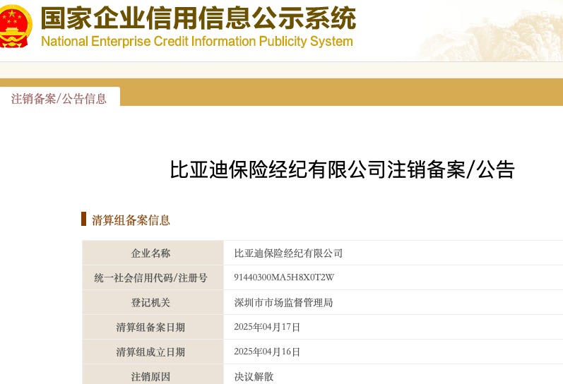 4月29日,《每日经济新闻》记者查阅国家企业信用信息公示系统官网发现,比亚迪保险经纪有限公司(以下简称比亚迪保险经纪)于4月17日发布注销备案公告,公示期为2025年4月17日至2025年6月1日,注销原因为“决议解散”。