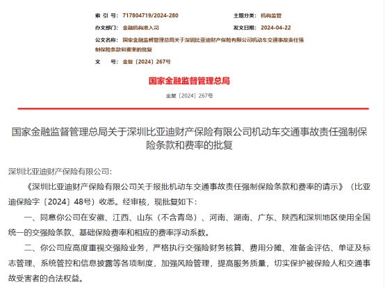 经过一年的布局,比亚迪保险终于于去年5月拿到车险“准生证”。2024年5月6日,国家金融监督管理总局发布公告称,同意比亚迪保险在安徽、江西、山东(不含青岛)、河南、湖南、广东、陕西和深圳地区使用全国统一的交强险条款、基础保险费率和相应的费率浮动系数。这也是继去年11月比亚迪财险车险业务范围被批准后,其车险业务再次获得实质性进展。