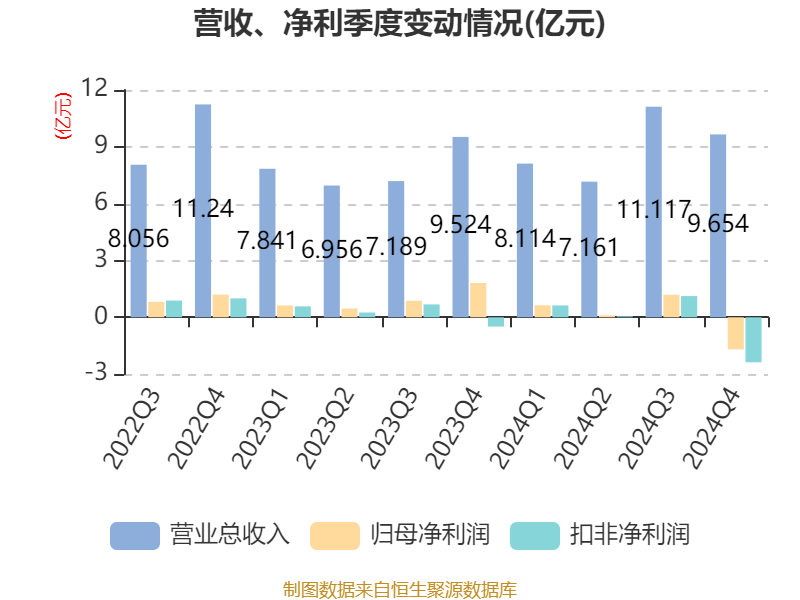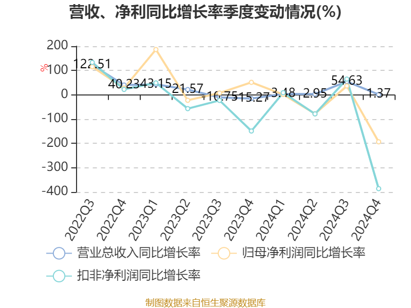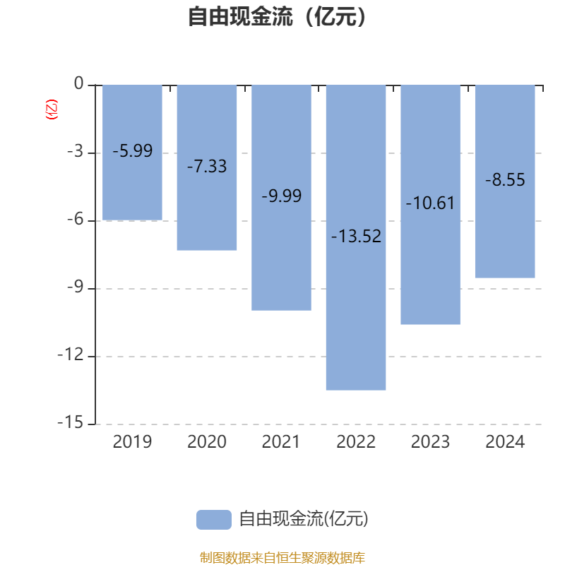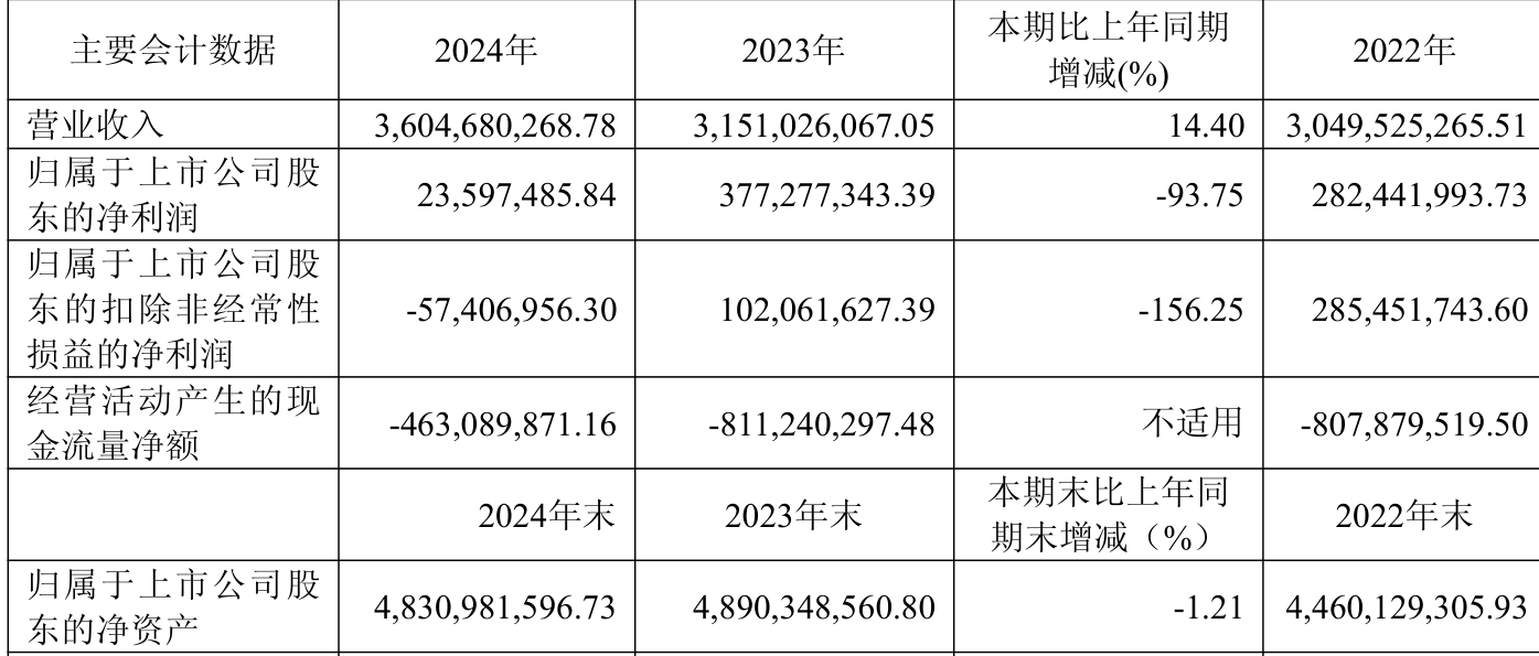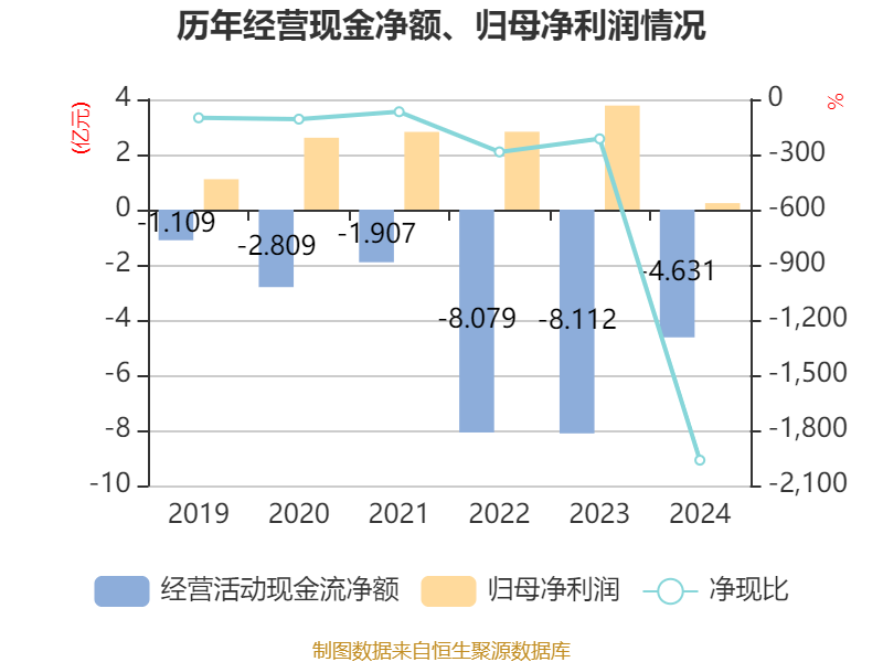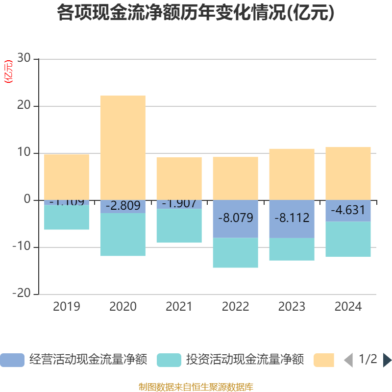 截至2024年,公司经营活动现金流净额为-4.63亿元,同比增加3.48亿元;筹资活动现金流净额11.25亿元,同比增加3919.51万元;投资活动现金流净额-7.46亿元,上年同期为-4.78亿元。