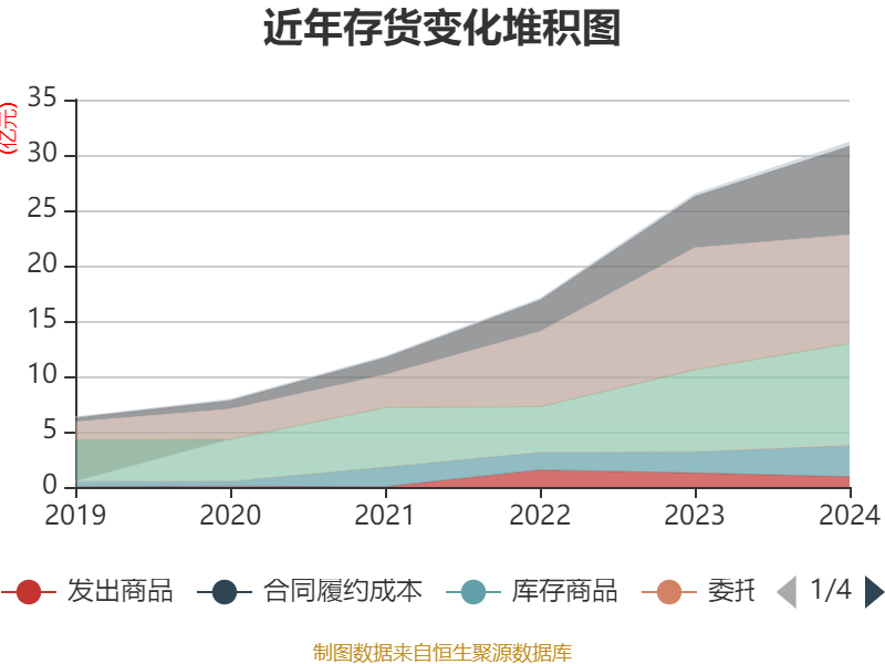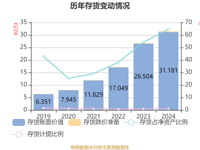 从存货变动来看,截至2024年末,公司存货账面价值为31.18亿元,占净资产的64.54%,较上年末增加4.68亿元。其中,存货跌价准备为3255.07万元,计提比例为1.03%。