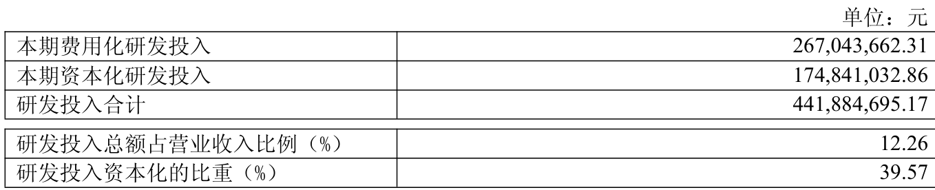2024年全年,公司研发投入金额为4.42亿元,同比增长43.87%;研发投入占营业收入比例为12.26%,相比上年同期上升2.51个百分点。此外,公司全年研发投入资本化率为39.57%。