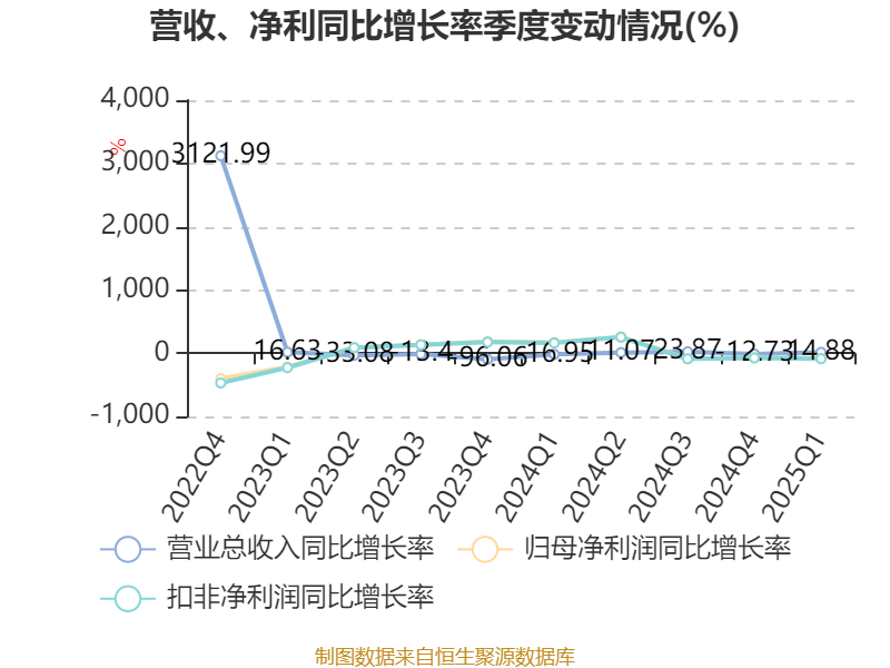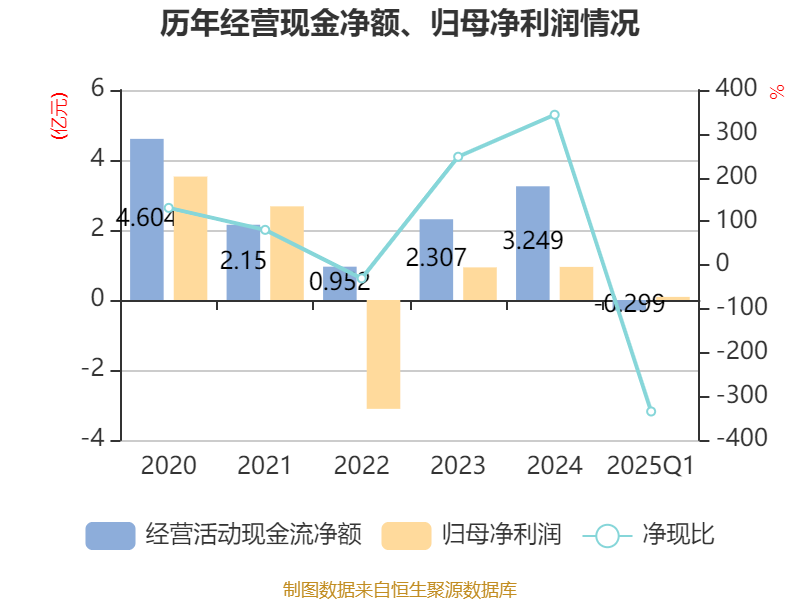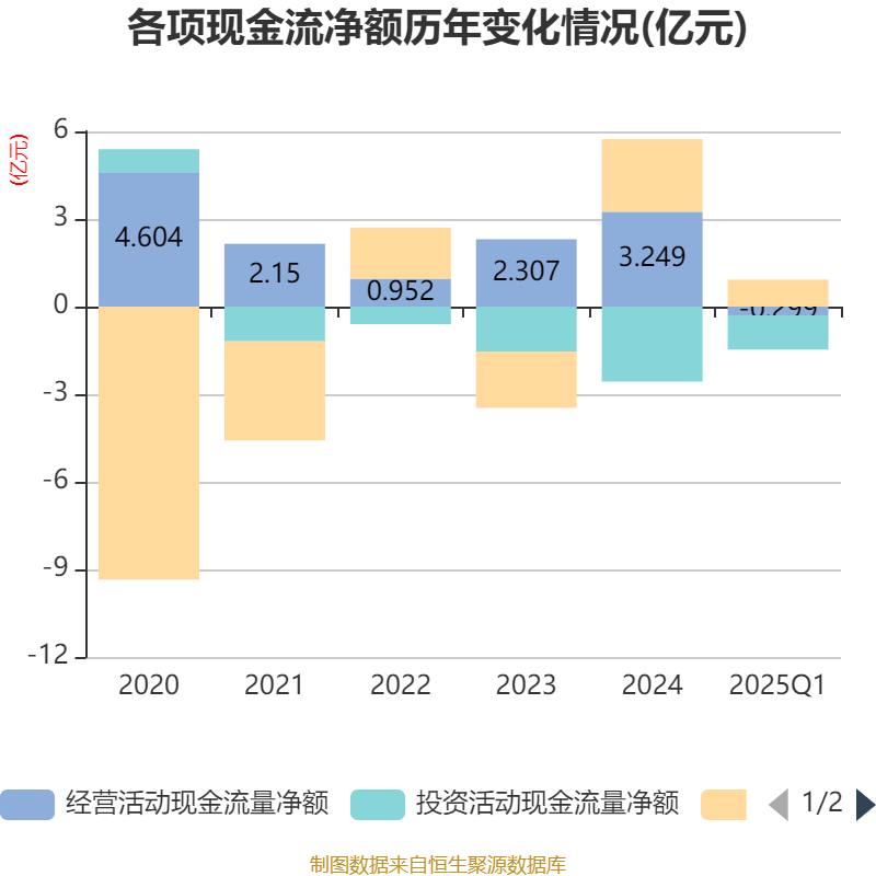 截至2025年一季度末,公司经营活动现金流净额为-2991.49万元,同比减少1.54亿元;筹资活动现金流净额9228.94万元,同比减少3051.05万元;投资活动现金流净额-1.17亿元,上年同期为-1.04亿元。