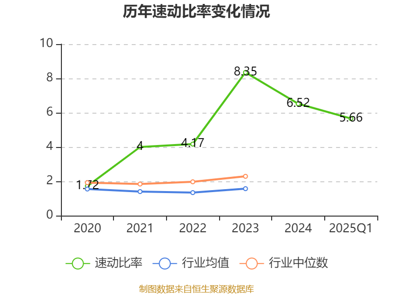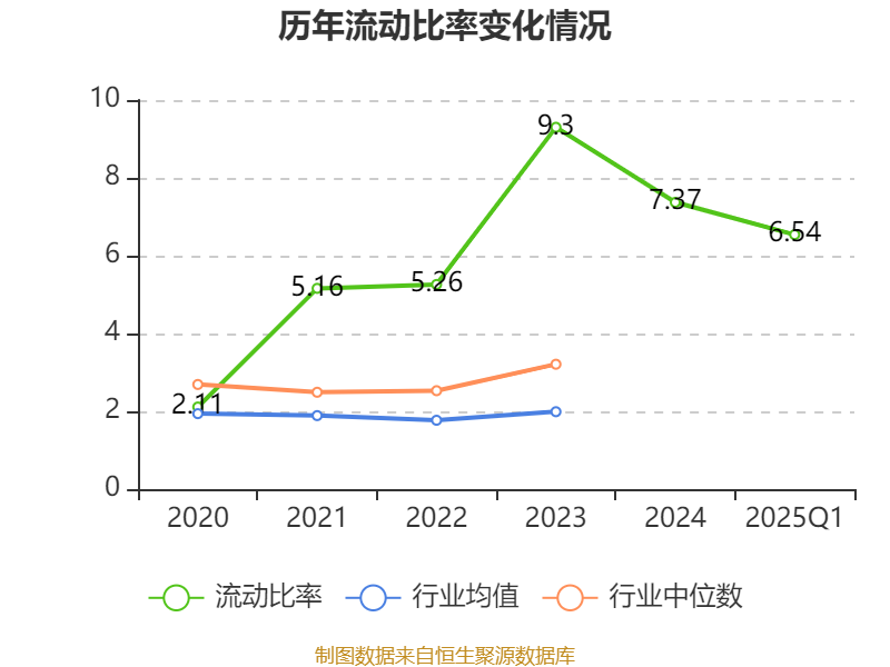 2025年第一季度,公司流动比率为6.54,速动比率为5.66。