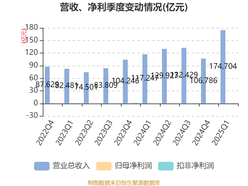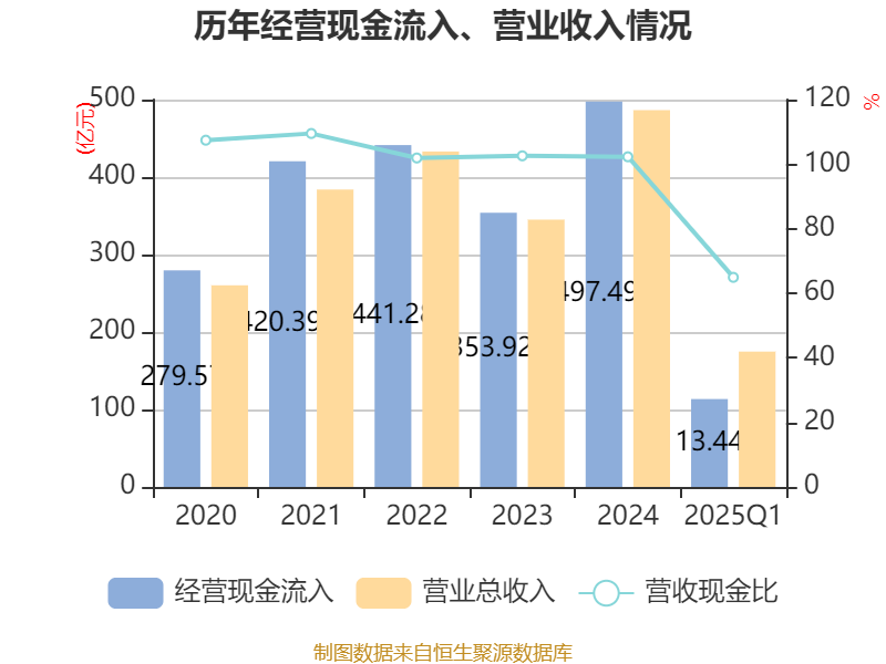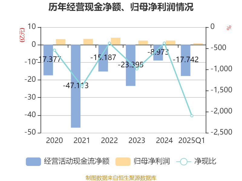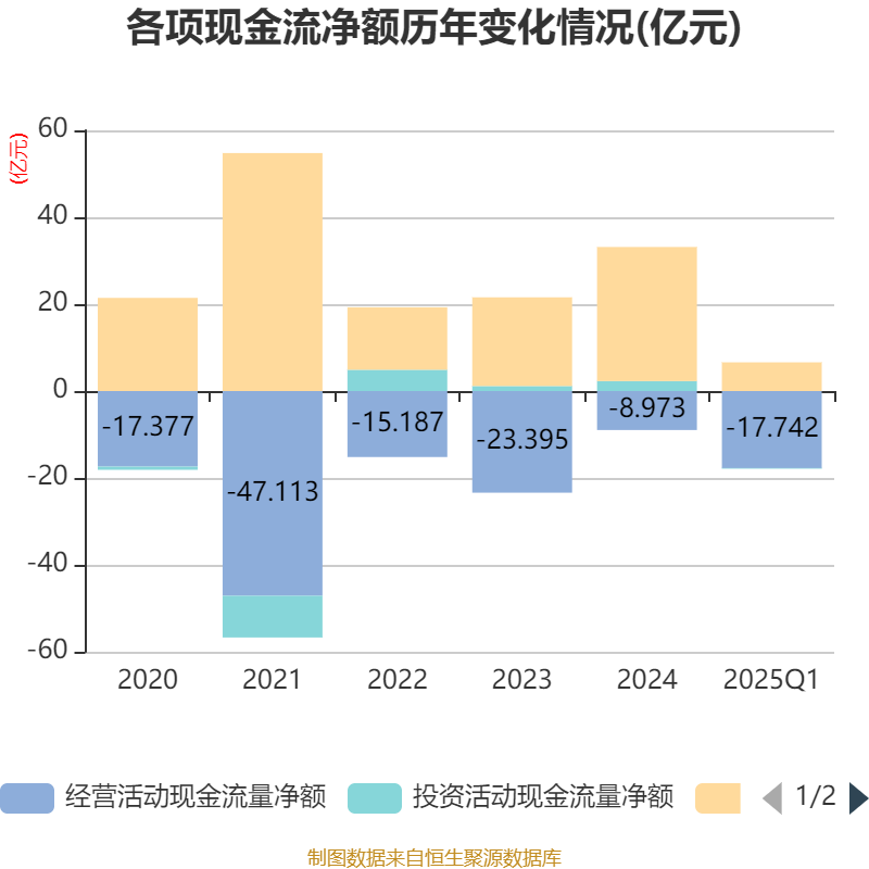 截至2025年一季度末,公司经营活动现金流净额为-17.74亿元,同比减少14.04亿元;筹资活动现金流净额6.61亿元,同比减少4.06亿元;投资活动现金流净额-1458.35万元,上年同期为-847.18万元。