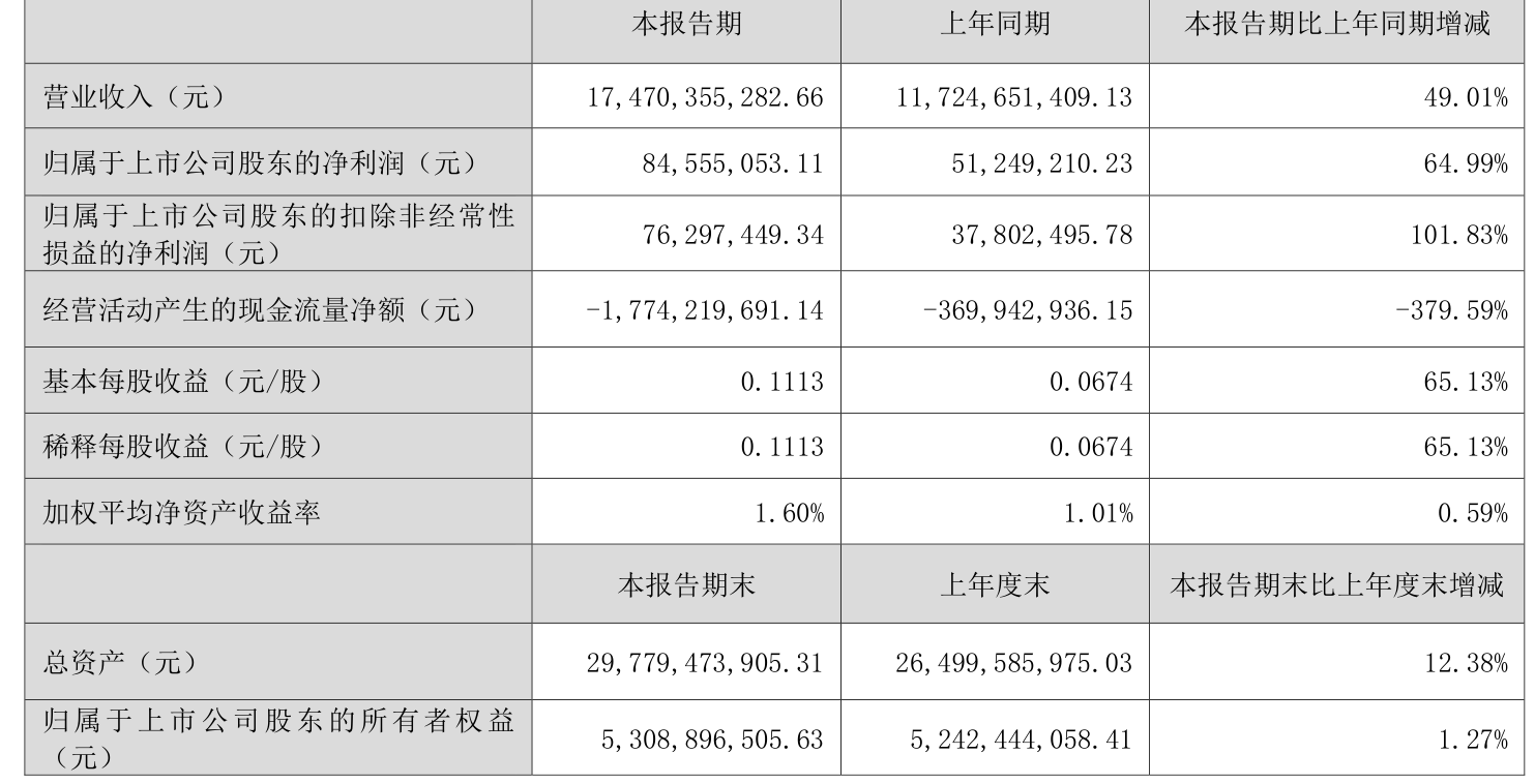 中证智能财讯中电港(001287)4月29日披露2025年第一季度报告。公司实现营业总收入174.7亿元,同比增长49.01%;归母净利润8455.51万元,同比增长64.99%;扣非净利润7629.74万元,同比增长101.83%;经营活动产生的现金流量净额为-17.74亿元,上年同期为-3.7亿元;报告期内,中电港基本每股收益为0.1113元,加权平均净资产收益率为1.60%。