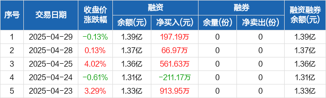 融资方面,当日融资买入2875.05万元,融资偿还2677.86万元,融资净买入197.19万元,连续3日净买入累计825.79万元。融券方面,融券卖出0份,融券偿还0份,融券余量0份,融券余额0元。融资融券余额合计1.39亿元。