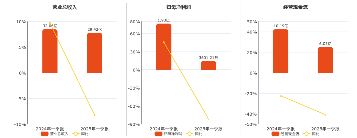 公司营业总收入为29.42亿元,在已披露的同业公司中排名第1,较去年同报告期营业总收入减少2.65亿元,同比较去年同期下降8.25%。归母净利润为3601.21万元,在已披露的同业公司中排名第3,较去年同报告期归母净利润减少1.54亿元,同比较去年同期下降81.03%。经营活动现金净流入为6.03亿元,在已披露的同业公司中排名第2,较去年同报告期经营活动现金净流入减少4.16亿元,同比较去年同期下降40.84%。