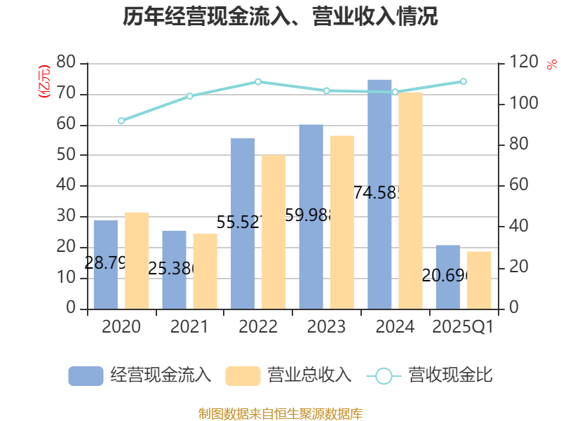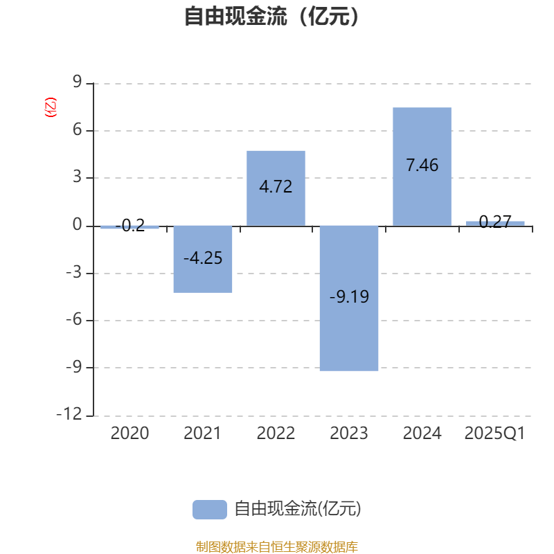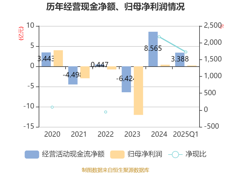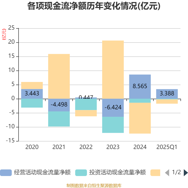 截至2025年一季度末,公司经营活动现金流净额为3.39亿元,同比增长555.45%;筹资活动现金流净额-1.54亿元,同比增加3.76亿元;投资活动现金流净额-2239.35万元,上年同期为-2717.91万元。