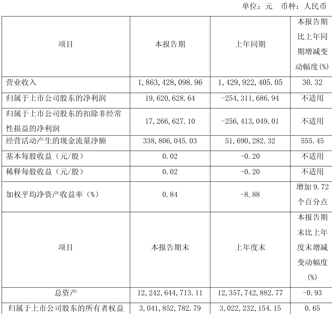 中证智能财讯新五丰(600975)4月29日披露2025年第一季度报告。公司实现营业总收入18.63亿元,同比增长30.32%;归母净利润1962.06万元,同比扭亏;扣非净利润1726.66万元,同比扭亏;经营活动产生的现金流量净额为3.39亿元,同比增长555.45%;报告期内,新五丰基本每股收益为0.02元,加权平均净资产收益率为0.84%。