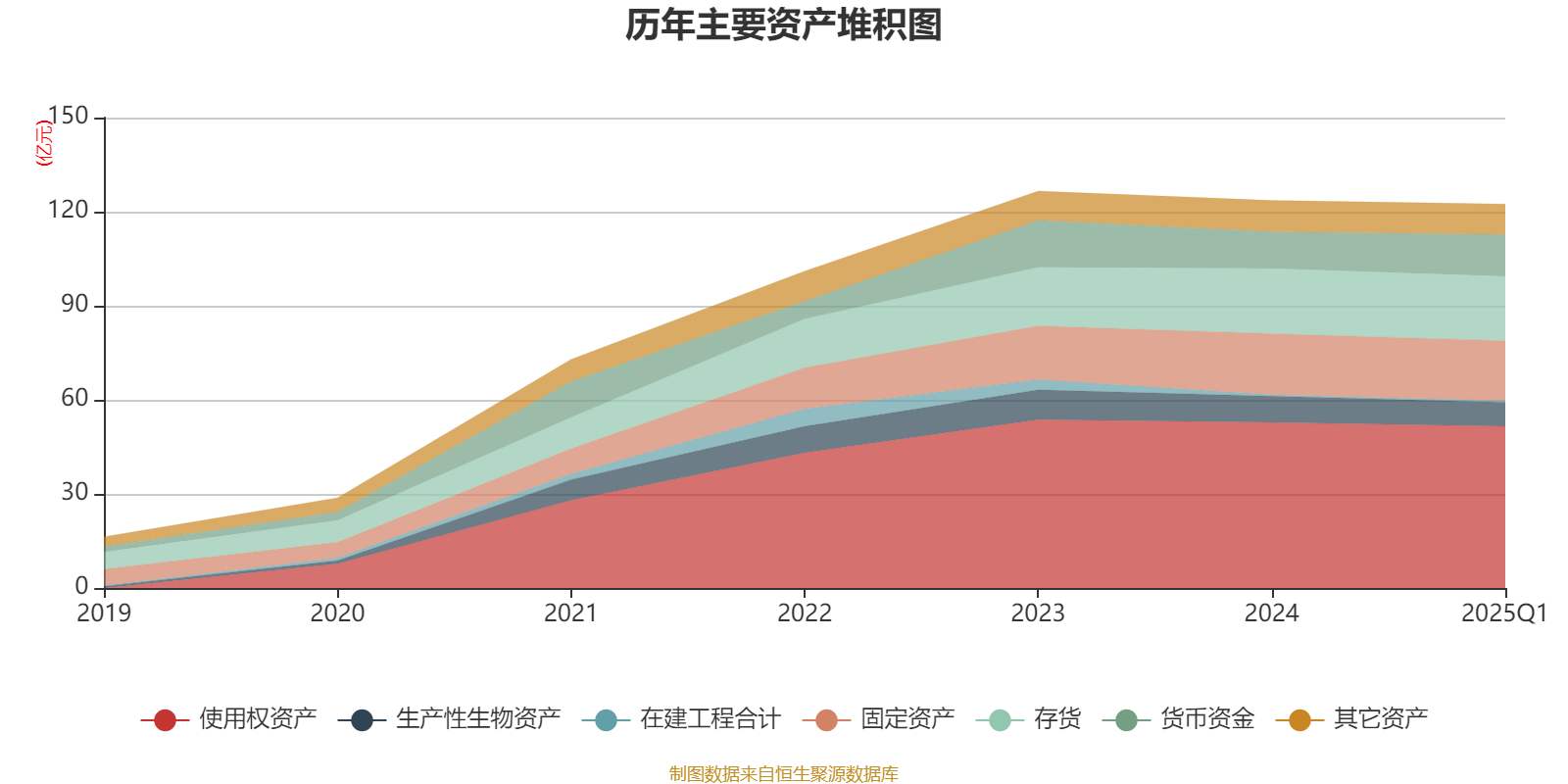资产重大变化方面,截至2025年一季度末,公司货币资金较上年末增加13.97%,占公司总资产比重上升1.42个百分点;使用权资产较上年末减少2.37%,占公司总资产比重下降0.62个百分点;生产性生物资产较上年末减少8.15%,占公司总资产比重下降0.49个百分点;应收票据及应收账款较上年末减少23.68%,占公司总资产比重下降0.28个百分点。