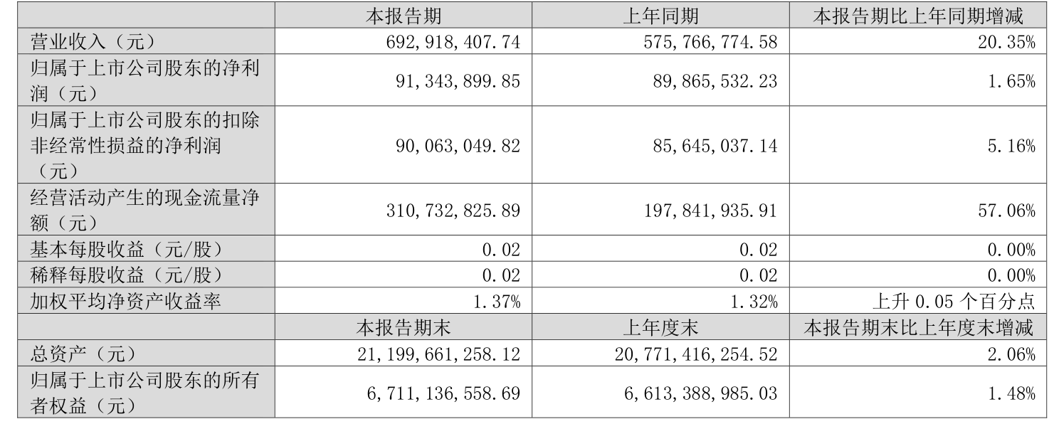 中证智能财讯南网能源(003035)4月29日披露2025年第一季度报告。公司实现营业总收入6.93亿元,同比增长20.35%;归母净利润9134.39万元,同比增长1.65%;扣非净利润9006.3万元,同比增长5.16%;经营活动产生的现金流量净额为3.11亿元,同比增长57.06%;报告期内,南网能源基本每股收益为0.02元,加权平均净资产收益率为1.37%。
