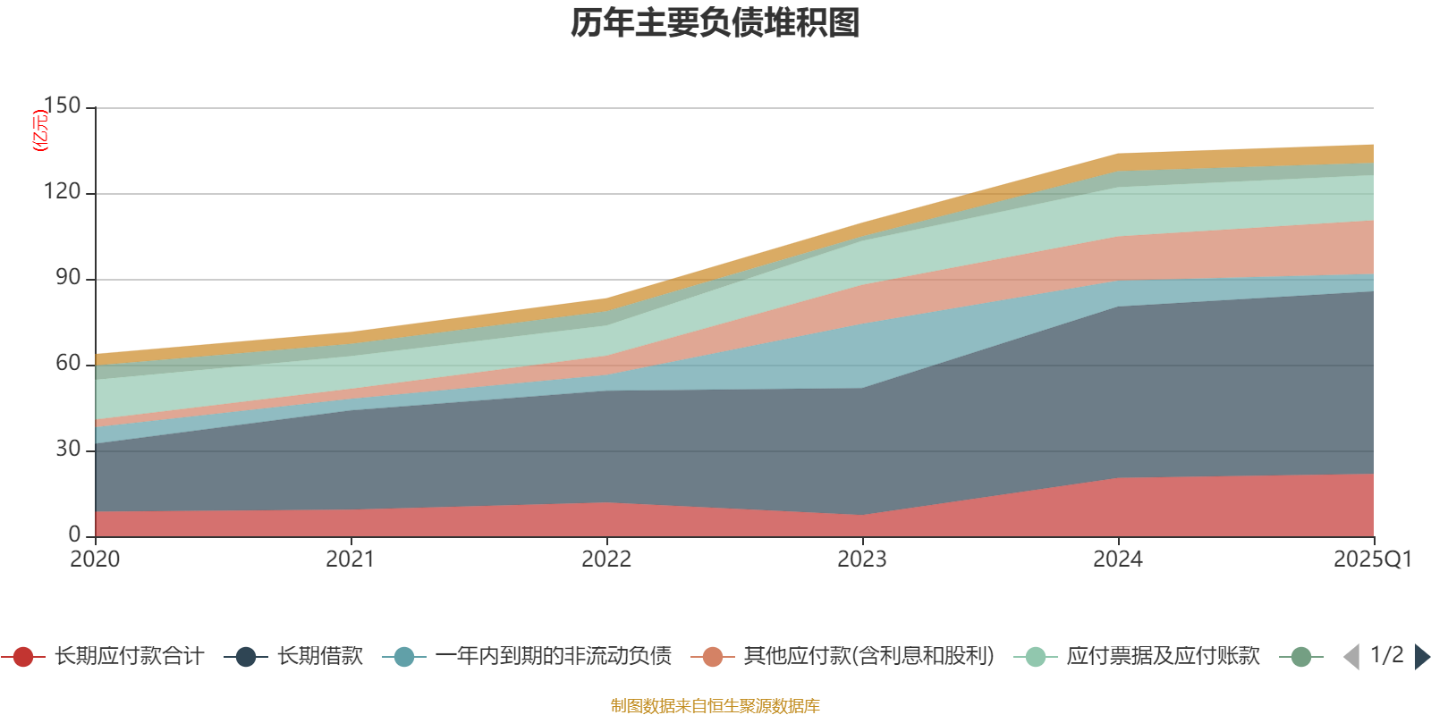 负债重大变化方面,截至2025年一季度末,公司一年内到期的非流动负债较上年末减少33.04%,占公司总资产比重下降1.51个百分点;其他应付款(含利息和股利)较上年末增加21.41%,占公司总资产比重上升1.41个百分点;长期借款较上年末增加6.57%,占公司总资产比重上升1.27个百分点;应付票据及应付账款较上年末减少8.27%,占公司总资产比重下降0.84个百分点。