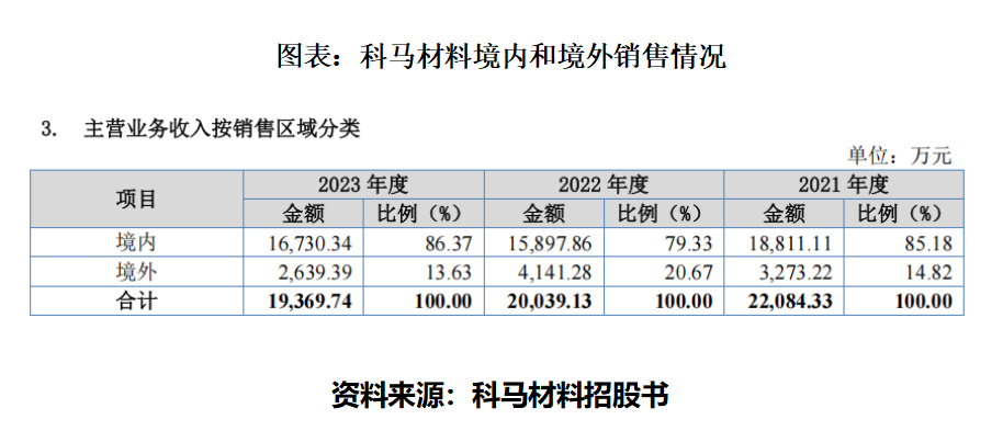 不过,2023年,科马材料来源于境外的营收仅为2639.39万元,营收占比为13.63%,同比减少了7个百分点。