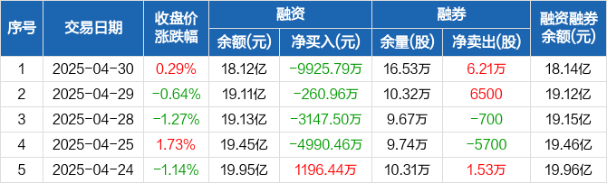 融资方面,当日融资买入2317.79万元,融资偿还1.22亿元,融资净偿还9925.79万元,净偿还额两市排名第12,连续4日净偿还累计1.83亿元。融券方面,融券卖出6.57万股,融券偿还3600股,融券余量16.53万股,融券余额229.93万元。融资融券余额合计18.14亿元。
