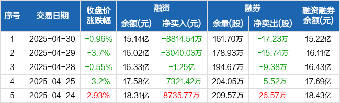 融资方面,当日融资买入8628.75万元,融资偿还1.74亿元,融资净偿还8814.54万元,净偿还额两市排名第20,连续4日净偿还累计3.17亿元。融券方面,融券卖出4.5万股,融券偿还21.73万股,融券余量161.7万股,融券余额834.38万元。融资融券余额合计15.22亿元。