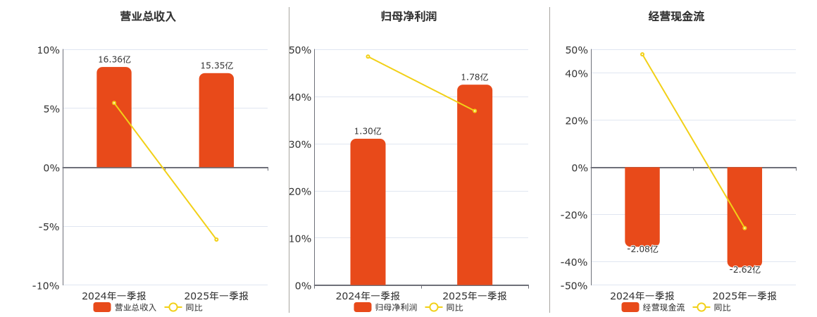 公司营业总收入为15.35亿元,较去年同报告期营业总收入减少1.00亿元,同比较去年同期下降6.14%。归母净利润为1.78亿元。经营活动现金净流入为-2.62亿元,在已披露的同业公司中排名第183,较去年同报告期经营活动现金净流入减少5384.04万元。