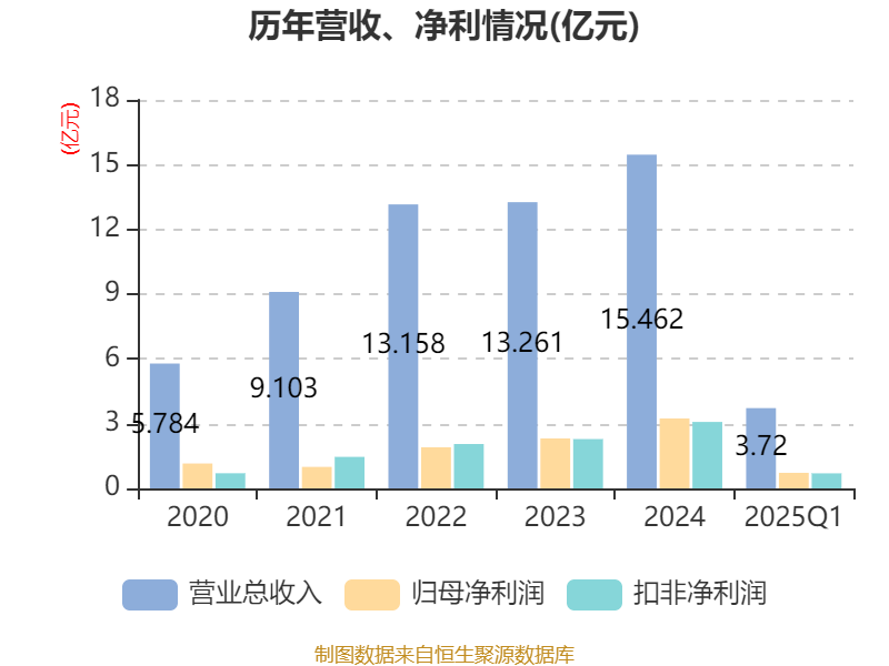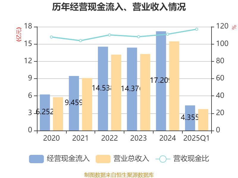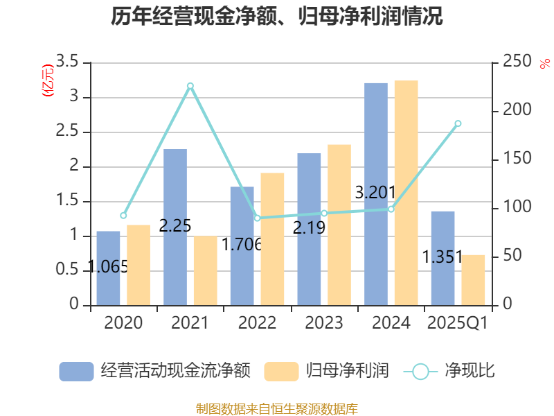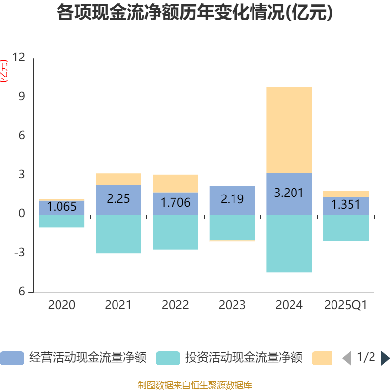截至2025年一季度末,公司经营活动现金流净额为1.35亿元,同比增长67.73%;筹资活动现金流净额4534.81万元,同比增加4713.39万元;投资活动现金流净额-2.05亿元,上年同期为-6161.15万元。