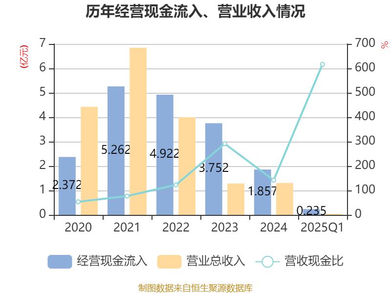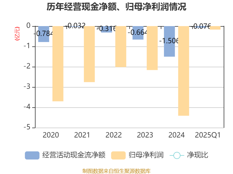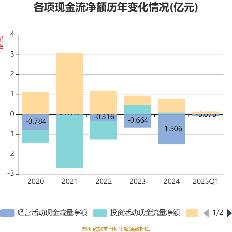 截至2025年一季度末,公司经营活动现金流净额为-755.32万元,同比增加3573.23万元;筹资活动现金流净额1398.02万元,同比增加3747.72万元;投资活动现金流净额4500元,上年同期为773.81万元。