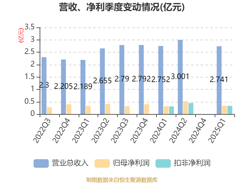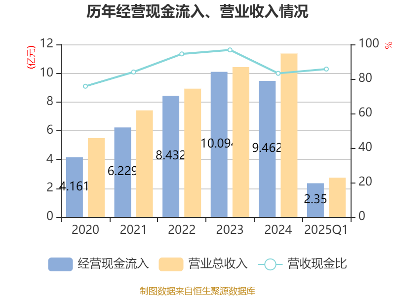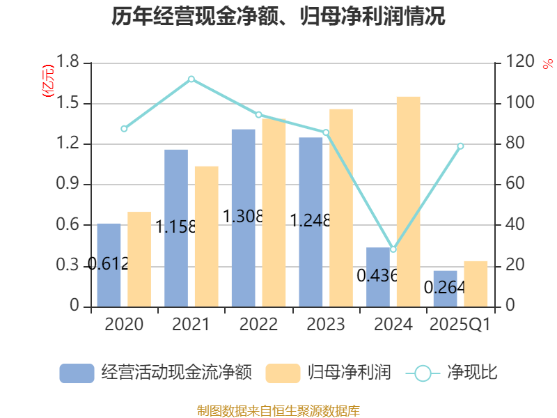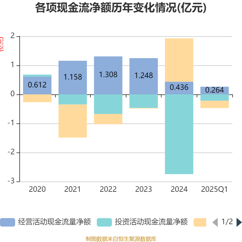 截至2025年一季度末,公司经营活动现金流净额为2644.51万元,同比增加4171.35万元;筹资活动现金流净额-2549.1万元,同比减少2.08亿元;投资活动现金流净额-2173.51万元,上年同期为-2.12亿元。