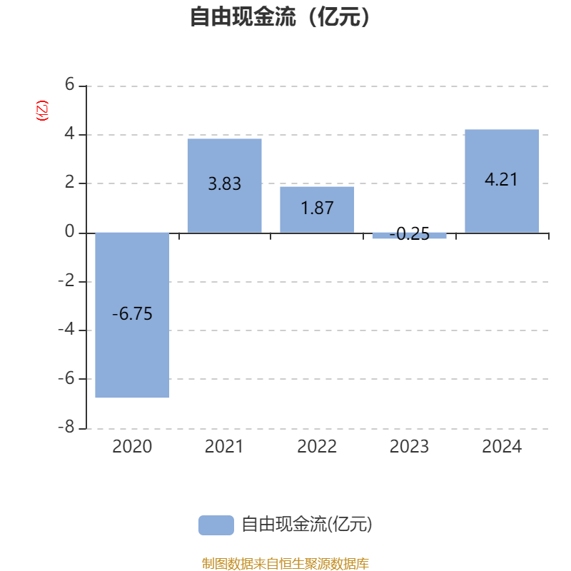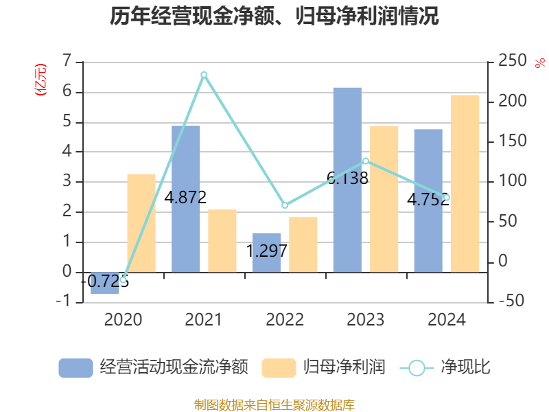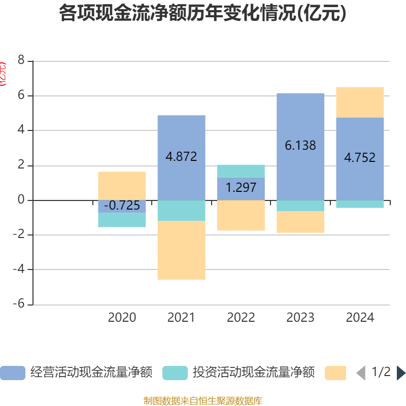 截至2024年,公司经营活动现金流净额为4.75亿元,同比下降22.58%;筹资活动现金流净额1.74亿元,同比增加2.98亿元;投资活动现金流净额-4496.56万元,上年同期为-6353.24万元。