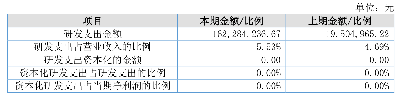 2024年全年,公司研发投入金额为1.62亿元,同比增长35.8%;研发投入占营业收入比例为5.53%,相比上年同期上升0.84个百分点。此外,公司全年研发投入资本化率为0%。