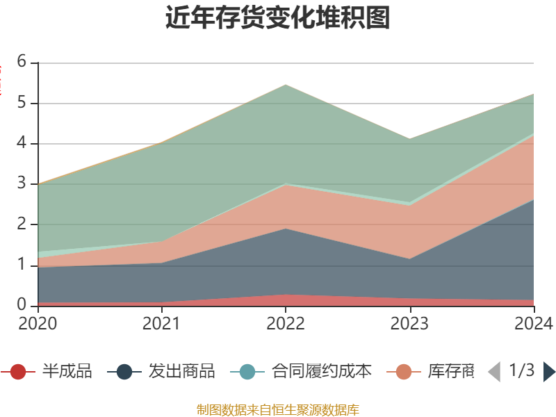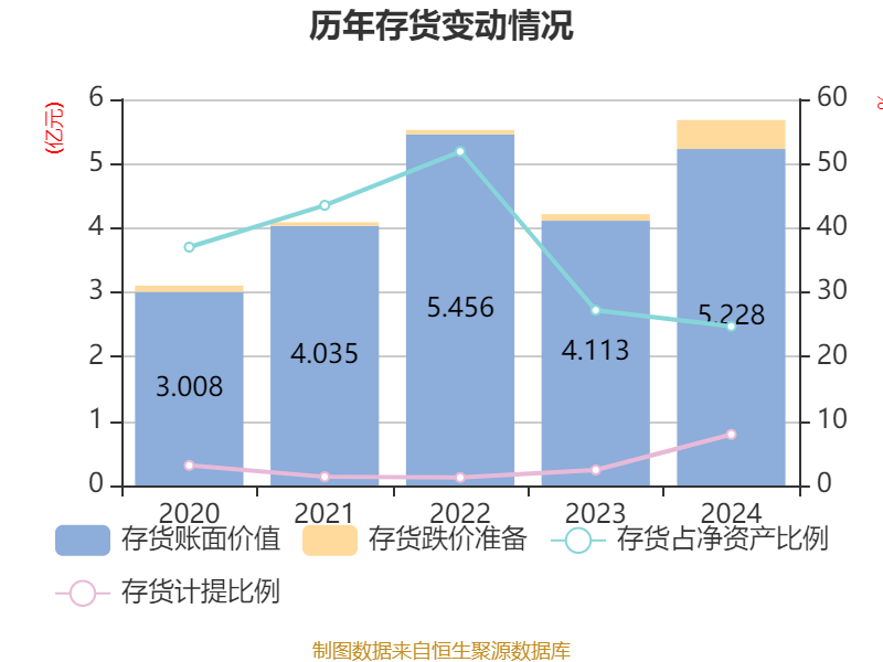 从存货变动来看,截至2024年末,公司存货账面价值为5.23亿元,占净资产的24.71%,较上年末增加1.12亿元。其中,存货跌价准备为4503.36万元,计提比例为7.93%。
