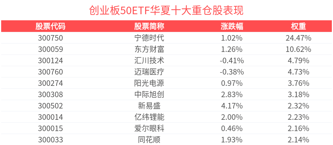 数据显示,截至2025年4月30日,创业板50指数(399673)前十大权重股分别为宁德时代(300750)、东方财富(300059)、汇川技术(300124)、迈瑞医疗(300760)、阳光电源(300274)、中际旭创(300308)、新易盛(300502)、爱尔眼科(300015)、亿纬锂能(300014)、同花顺(300033),前十大权重股合计占比64.53%。