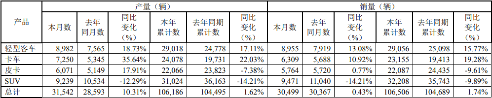 5月6日,江铃汽车(000550/200550)发布公告,公司4月总产量为3.15万辆,同比增长10.31%,总销量为3.05万辆,同比增长0.43%。具体数据如下: