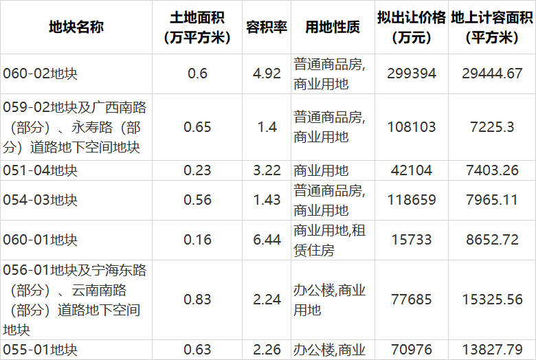 公示文件显示,060-02地块、059-02地块和054-03地块靠近金陵东路,均规划为普通商品房、商业用地,商业的比例均为10%,另外90%为住宅;地上建筑面积分别为29444.67平方米、7225.3平方米、7965.11平方米。其中,060-02地块容积率4.92,规划有150米超高层、商业等。