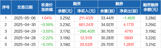 融资方面,当日融资买入559.84万元,融资偿还348.41万元,融资净买入211.43万元。融券方面,融券卖出1900股,融券偿还1.68万股,融券余量33.44万股,融券余额228.36万元。融资融券余额合计3.28亿元。
