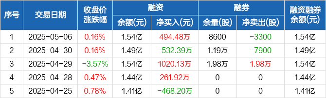 融资方面,当日融资买入1038.84万元,融资偿还544.36万元,融资净买入494.48万元。融券方面,融券卖出0股,融券偿还3300股,融券余量8600股,融券余额5.37万元。融资融券余额合计1.54亿元。