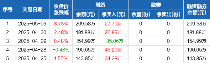 融资方面,当日融资买入149.96万元,融资偿还122.26万元,融资净买入27.7万元。融券方面,融券卖出0份,融券偿还0份,融券余量0份,融券余额0元。融资融券余额合计209.58万元。