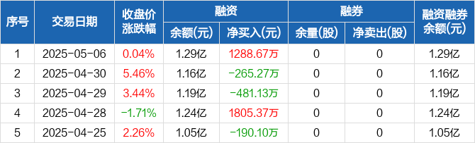 融资方面,当日融资买入1921.3万元,融资偿还632.63万元,融资净买入1288.67万元。融券方面,融券卖出0股,融券偿还0股,融券余量0股,融券余额0元。融资融券余额合计1.29亿元。