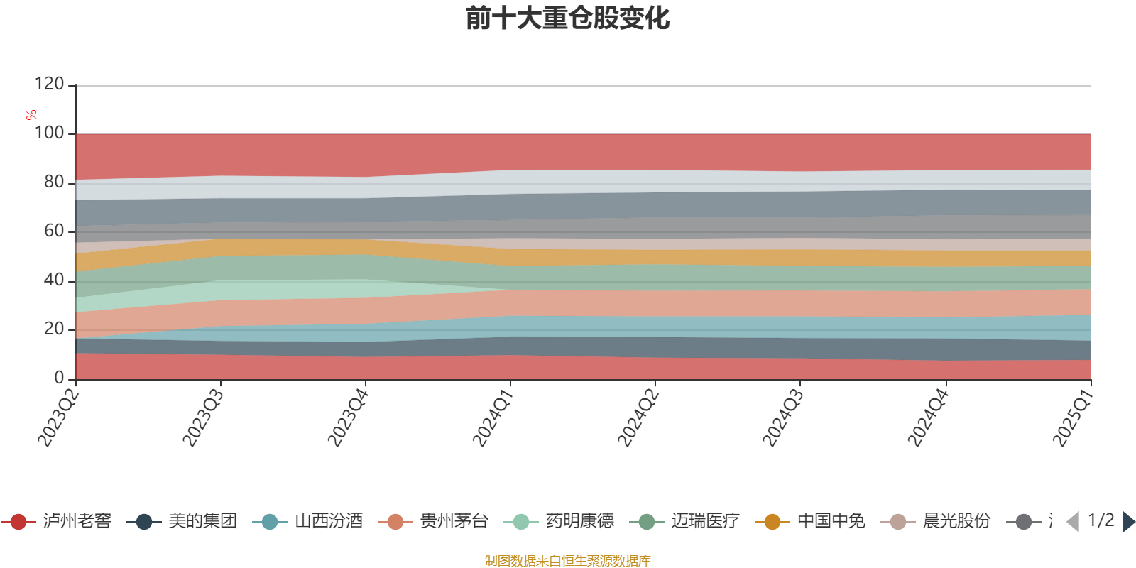 该基金持股集中度较高,且持股标的较为稳定,近2年前十大重仓股集中度长期超过60%。截至2025年一季度末,基金十大重仓股分别是山西汾酒、贵州茅台、五粮液、海大集团、迈瑞医疗、古井贡酒、泸州老窖、美的集团、中国中免、晨光股份。