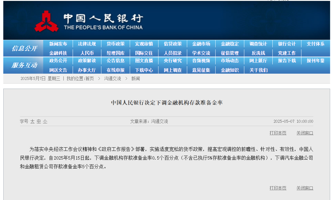 本报讯 (记者韩昱)中国人民银行5月7日发布消息称,为落实中央经济工作会议精神和《政府工作报告》部署,实施适度宽松的货币政策,提高宏观调控的前瞻性、针对性、有效性,中国人民银行决定,自2025年5月15日起,下调金融机构存款准备金率0.5个百分点(不含已执行5%存款准备金率的金融机构),下调汽车金融公司和金融租赁公司存款准备金率5个百分点。