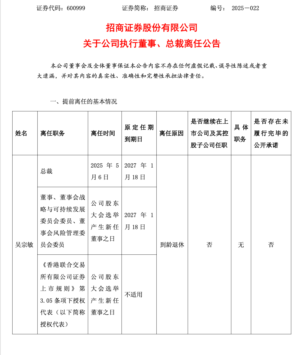 根据公告,吴宗敏于5月6日正式从招商证券总裁一职离任,其担任的董事及董事会相关职务,以及港交所授权代表职务,将在股东大会选举产生新任董事后卸任。