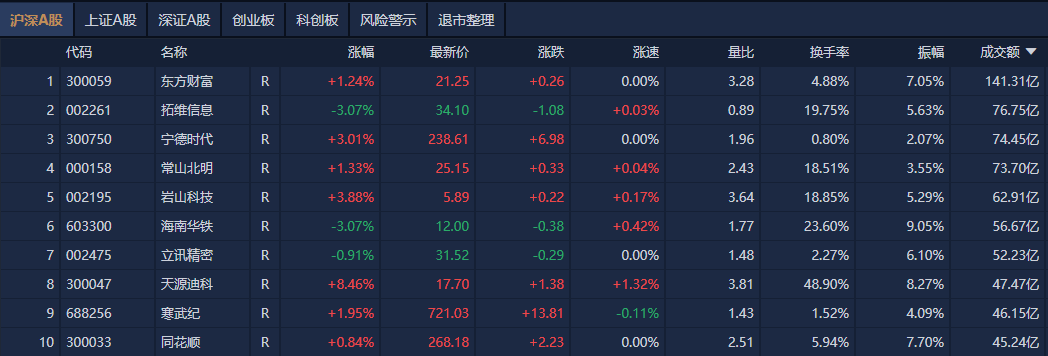 沪深两市全天成交额1.47万亿,较上个交易日放量1321亿。个股方面,东方财富成交额超141亿元居首,拓维信息、宁德时代、常山北明成交额靠前。